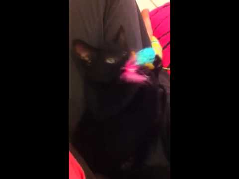 Aden loves his new sparkly feather birdie toy! Here he is showing it that his the boss!